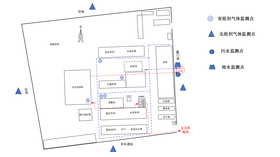 污水總排口一個,位于廠區(qū)東側(cè)外墻外,大氣排放口共5個,其中污水處理1個,氯化2個,干燥1個,包裝1個 |